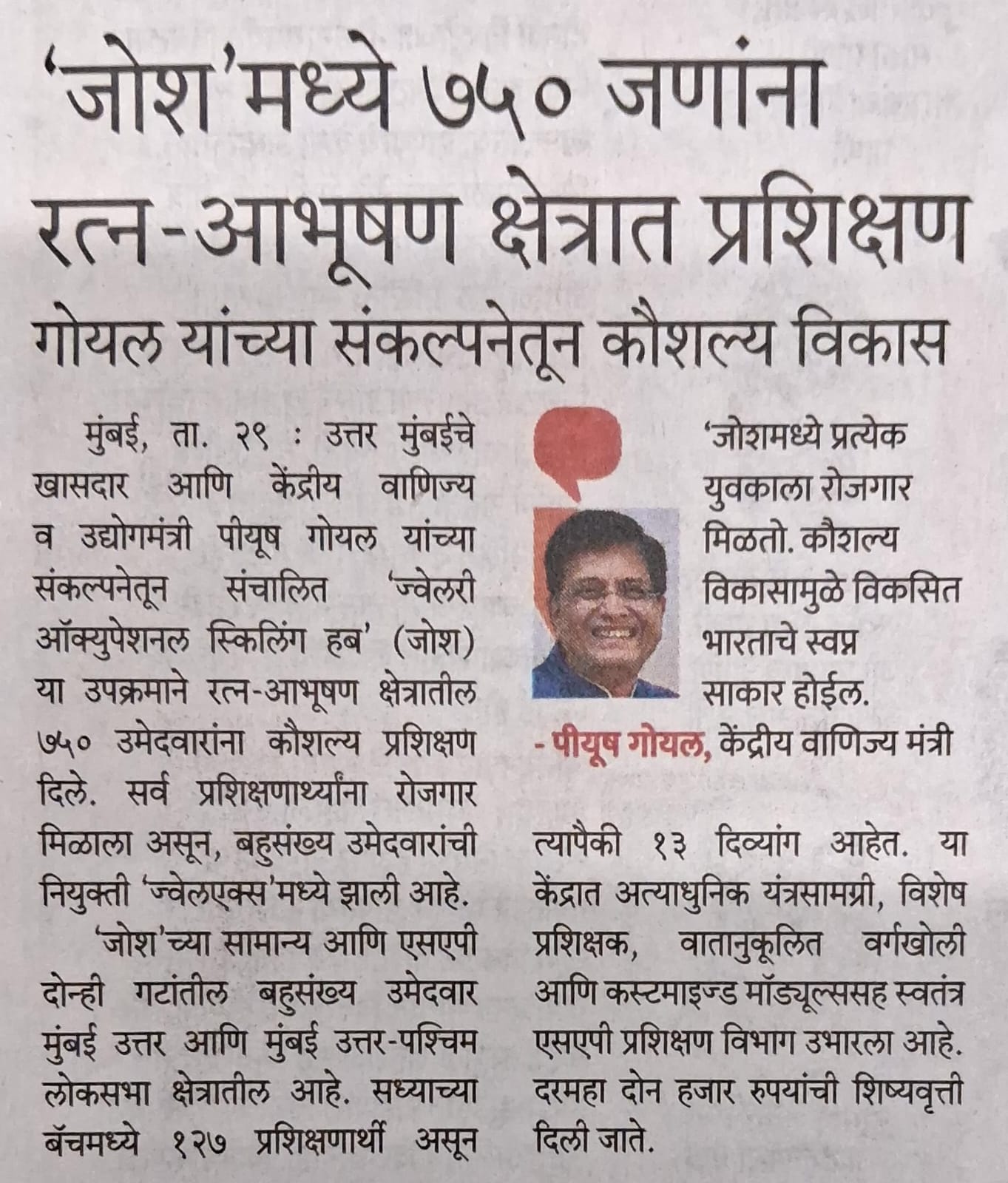 'जोश' रत्न और आभूषण के क्षेत्र में 750 लोगों को प्रशिक्षित कर रहा है, गोयल की अवधारणा के माध्यम से कौशल विकास